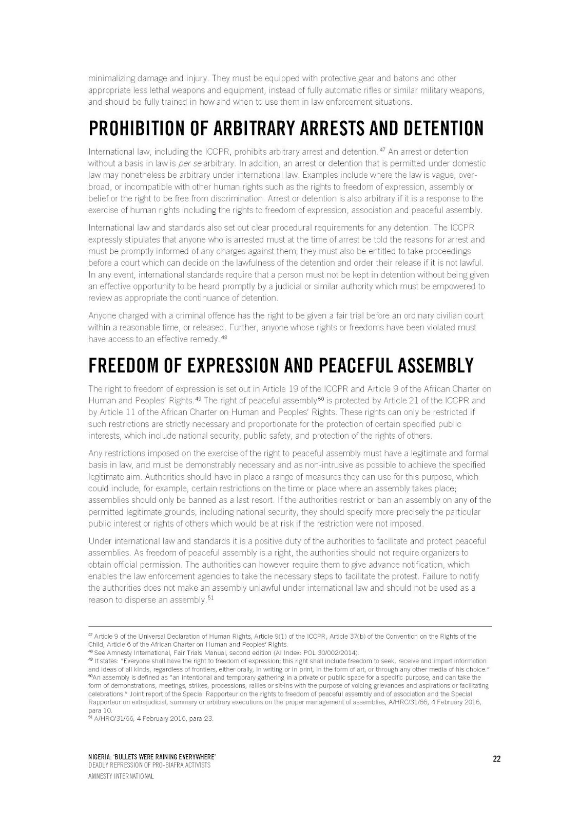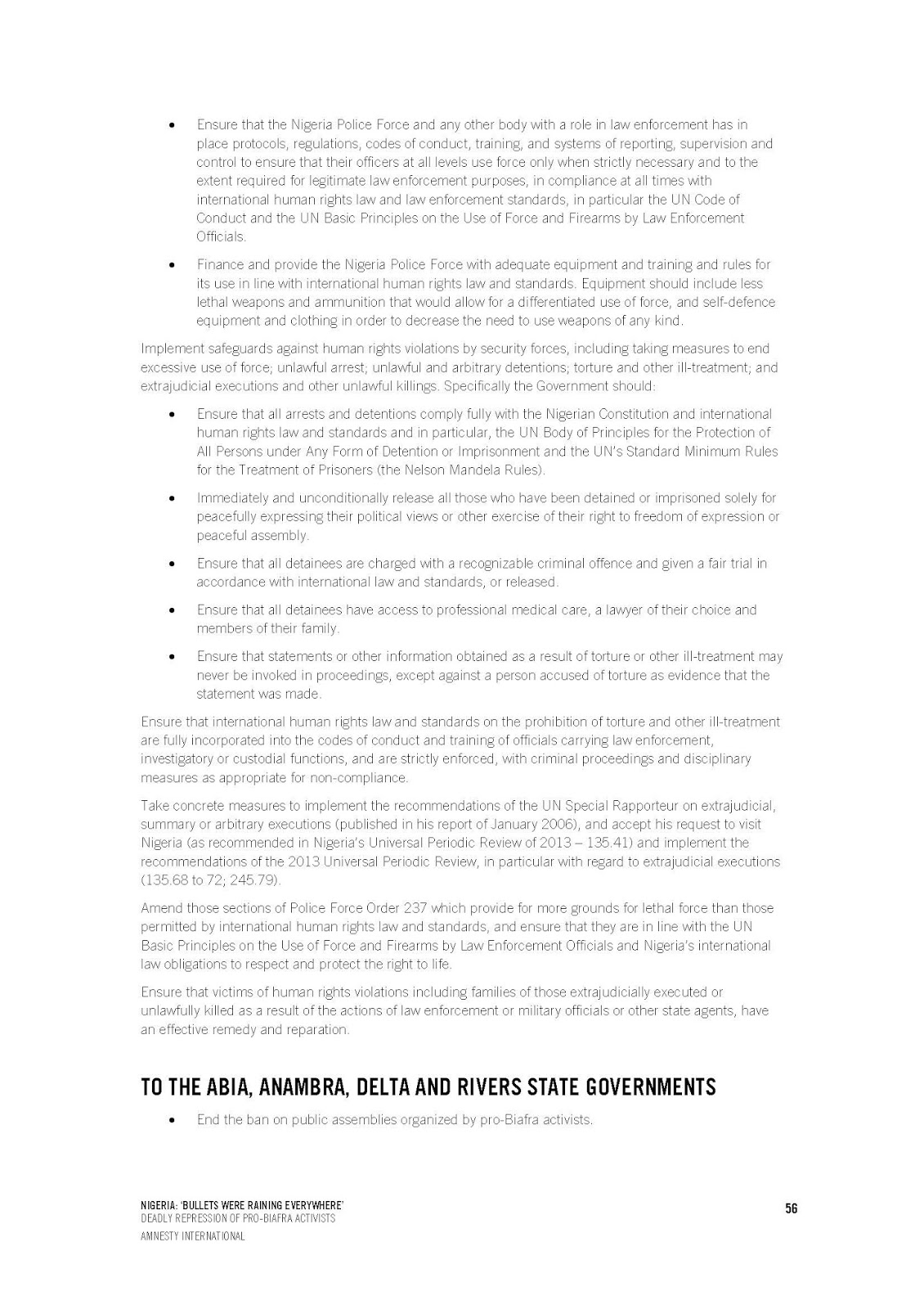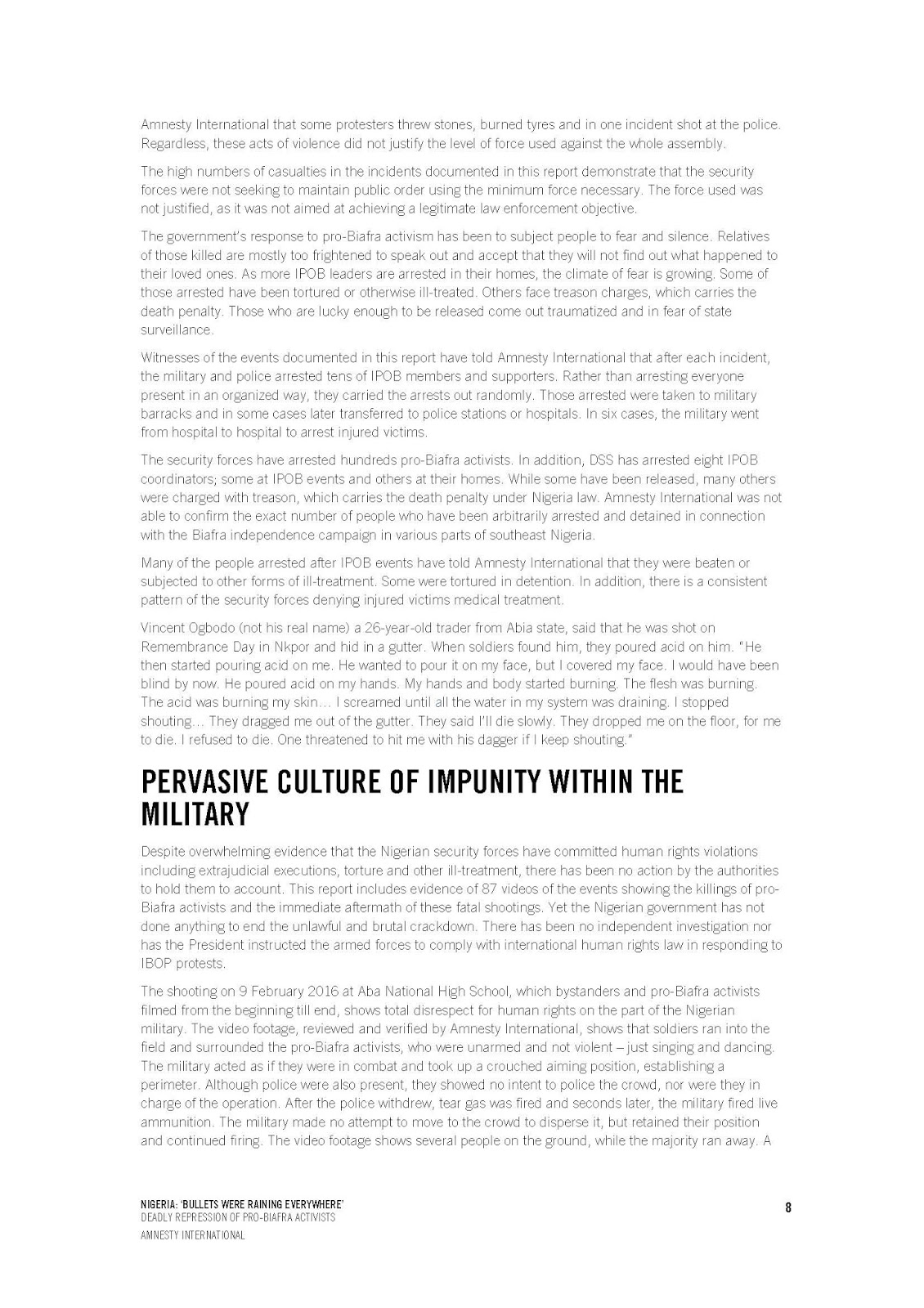 Since August 2015, the security forces have killed at least 150 members and supporters of the pro-Biafran organization IPOB (Indigenous People of Biafra) and injured hundreds during non-violent meetings, marches and other gatherings. This report focuses on the crisis brewing in the southeast of Nigeria, where IPOB campaigns for an independent state of Biafra. It documents extrajudicial executions and the use of excessive force by military, police and other security agencies. It also shows a worrying pattern of arbitrary arrests and detentions, including soldiers arresting wounded victims in hospital, and of torture and other ill-treatment of detainees.