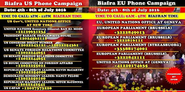 This Monday, July 4th to Friday, July 8, Biafrans and friends all over the world will commence another round of phone campaign to officials of United States of America (USA); European Union (EU) and United Nation (UN).